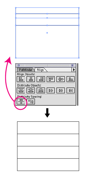 일러 8.0에서는 사각형박스를 먼저 그린후 가로선을 복사해서 넣고 전체선택을 하던지 가로선만 부분선택을 하던지, 올린그림과 같이 정렬을 하면 사각박스내에 간격정렬이 됩니다.